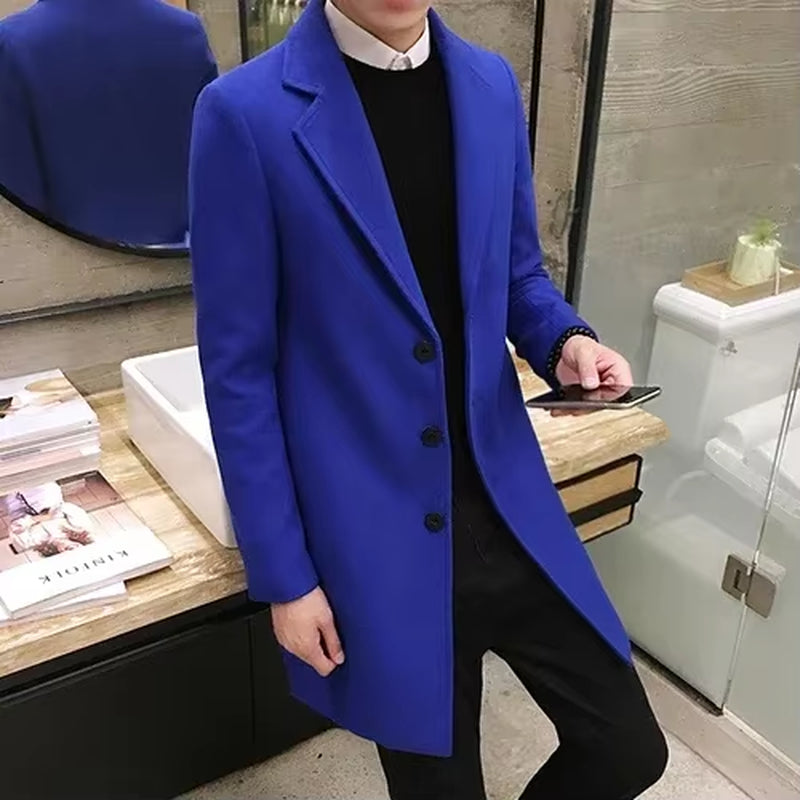 Mens Long Cotton Coat Spring Autumn New Wool Blend Pure Color Slim Casual Business Fashion Mens Clothing Slim Windbreaker Jacket